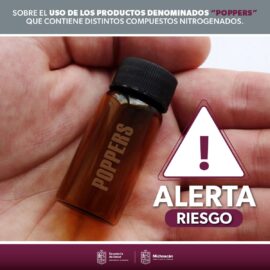 Morelia, Michoacán a 14 de septiembre del 2023.- La Comisión Federal para la Protección contra Riesgos Sanitarios (Cofepris), a través de la Secretaría de Salud de Michoacán (SSM), alerta a la población sobre el uso de productos denominados “poppers”, los cuales contienen compuestos nitrogenados como el nitrito de...