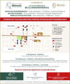 Morelia, Michoacán a 12 de septiembre del 2023.- El Gobierno de Michoacán dio a conocer el cierre vial que se llevará a cabo por las fiestas patrias 2023, el cual contempla varios cortes a la circulación en el Centro Histórico de Morelia, a partir del 12 y hasta...
