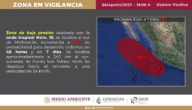 Morelia, Michoacán a 4 de agosto de 2023.- Tras el paso de la onda tropical número 18, se prevén lluvias intensas en la mayor parte de Michoacán. Ante el aviso especial por lluvias intensas, viento y oleaje elevado, lo que podría desarrollar actividad ciclónica, razón por la cual...