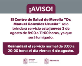 Morelia, Michoacán a 02 de Agosto de 2023.- La Secretaría de Salud de Michoacán (SSM) anuncia a la población que este jueves 3 de agosto serán suspendidos los servicios médicos a partir de las 11:00 horas en el Centro de Salud Urbano de Morelia Manuel González Urueña, por...