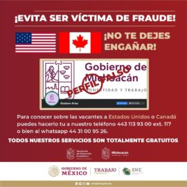 Morelia, Michoacán, 26 de julio de 2023.- La Secretaría de Desarrollo Económico (Sedeco) alertó a la población sobre cuentas falsas en redes sociales que promueven presuntas vacantes de empleo en Canadá, situación que puede poner en riesgo tu seguridad y hasta tu vida. Las cuentas que utilizan indebidamente...