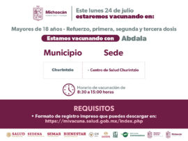 Morelia, Michoacán, a 24 de Julio del 2023.- Se mantiene la vacunación anti COVI-19 en 76 municipios, dirigida a población de 18 años que requieren refuerzo de la primer, segunda o tercera dosis. Del 24 al 31 de julio se estará inmunizando a pobladores de Lázaro Cárdenas, Contepec,...