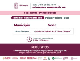 Morelia Michoacán a 22 de Julio de 2023.- La Secretaría de Salud de Michoacán (SSM) anunció las últimas fechas para la vacunación contra el COVID-19 dirigida a menores de cinco a 11 años, la cual se llevará a cabo del 24 al 28 de julio en tres municipios...