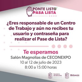 Morelia, Michoacán a 10 de Julio de 2023.- La Secretaría de Educación del Estado (SEE) convoca a directores de escuelas o cualquier otro Centro de Trabajo (CT) educativo, a las sesiones de capacitación y entrega de claves de acceso para el Pase de Lista. La convocatoria es para...