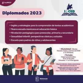 Morelia, Michoacán a 20 de Junio de 2023.- El Instituto Michoacano de Ciencias de la Educación (IMCED), José María Morelos, invita a estudiantes, docentes y público en general a participar en los diplomados de verano que realizará en modalidad híbrida. En esta ocasión se ofrecerán los diplomados en...