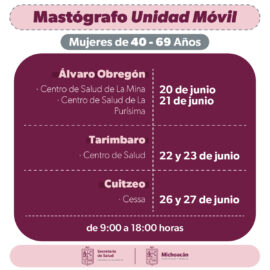 Morelia, Michoacán a 19 de Junio de 2023.- El cáncer de mamá es una enfermedad curable en etapas tempranas, es por ello que la Secretaría de Salud de Michoacán (SSM) llevará mastografías gratuitas a mujeres de 40 a 69 años de edad, en los municipios de Álvaro Obregón,...