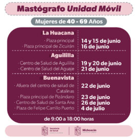 Morelia, Michoacán a 13 de Junio de 2023.- La Secretaría de Salud de Michoacán (SSM) invita a mujeres de entre 40 y 69 años de edad de los municipios de La Huacana, Aguililla y Buenavista, a realizarse una mastografía gratuita en las jornadas que la institución implementará del...