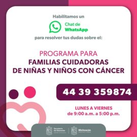 Morelia, Michoacán a 12 de Junio de 2023.- La Secretaría del Bienestar (Sedebi) facilita el registro al programa para Familias Cuidadoras de Niñas y Niños con Cáncer y pone a disposición un número de WhatsApp para obtener respuestas inmediatas a las preguntas más comunes sobre el proceso de...