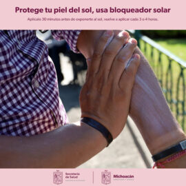Morelia, Michoacán, 29 de mayo de 2023.- Para prevenir quemaduras a consecuencia de la prolongada exposición a los rayos UV, la Secretaría de Salud de Michoacán (SSM) llama a la población a utilizar bloqueador solar antes de salir a la calle, o de realizar actividades al aire libre....