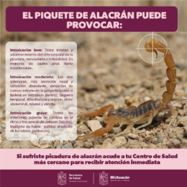 Morelia, Michoacán, 24 de mayo de 2023.- La Secretaría de Salud de Michoacán (SSM) ha brindado durante los primeros cuatro meses del año tratamiento médico oportuno a 3 mil 80 pacientes intoxicados por picadura de alacrán en hospitales y centros de salud del estado. De acuerdo con la...