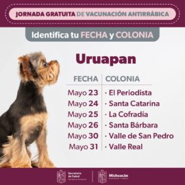 Uruapan, Michoacán, 24 de mayo de 2023.- La Secretaría de Salud de Michoacán refuerza en colonias de Uruapan las acciones de vacunación antirrábica canina y felina, para lo que resta del mes de mayo y hasta mediados de junio. La vacuna se aplica de forma permanente en el...