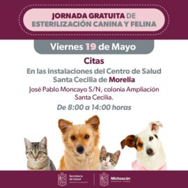 Morelia, Michoacán a 19 de Mayo de 2023.- La Secretaría de Salud de Michoacán (SSM) llevará a cabo una jornada gratuita de esterilización canina y felina en el centro de salud Santa Cecilia de Morelia, con el propósito de contribuir con el control de la reproducción animal. Para...