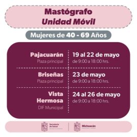 Morelia, Michoacán a 19 de Mayo de 2023.- La Secretaría de Salud de Michoacán (SSM) reforzará las acciones de detección oportuna del cáncer de mama en el interior del estado, con jornadas gratuitas de mastografía en los municipios de Pajacuarán, Briseñas y Vista Hermosa, del 19 al 26...
