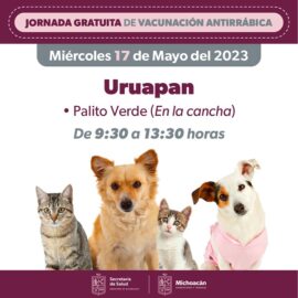 Uruapan, Michoacán, a 17 de Mayo del 2023.- La Secretaría de Salud de Michoacán (SSM) anuncia a la población la campaña de vacunación a perros y gatos en la cancha de la colonia Palito Verde, con el objetivo de prevenir la transmisión de la rabia a las mascotas...