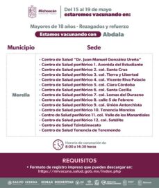 Morelia, Michoacán a 14 de Mayo de 2023.- A partir del lunes 15 de mayo, y hasta finalizar el mes, el sector salud reforzará la vacunación contra el COVID-19 entre los mayores de 18 años que no han completado esquemas o que apenas los van a iniciar, así...