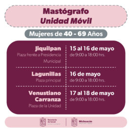 Morelia, Michoacán, 15 de mayo de 2023.- Del 15 al 18 de mayo la Secretaría de Salud de Michoacán (SSM) llevará mastografías gratuitas a mujeres de entre 40 a 69 años de edad, en los municipios de Jiquilpan, Lagunillas y Venustiano Carranza. La primera jornada será en Jiquilpan,...