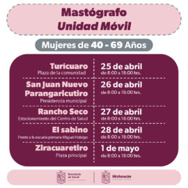 Morelia, Michoacán, 24 de abril de 2023.- Del 25 de abril al 1 de mayo, la Secretaría de Salud de Michoacán (SSM) llevará mastografías gratuitas a mujeres de entre 40 y 69 años de edad, en los municipios de Nahuatzen, Nuevo Parangaricutiro, Taretan, Uruapan y Ziracuaretiro. El martes...