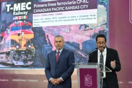 Morelia, Michoacán a 17 de Abril de 2023.- La fusión de las ferroviarias Kansas City Southern y Canadian Pacific Railway, que empezó a operar el 14 de abril, consolida a Lázaro Cárdenas como el puerto del T-MEC, expresó este lunes el secretario de Desarrollo Económico, Claudio Méndez Fernández.En rueda...