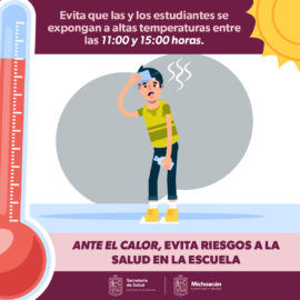 Morelia, Michoacán, 17 de abril de 2023.- La Secretaría de Salud de Michoacán (SSM) invita a las y los maestros a no exponer a las niñas, niños y jóvenes al sol, principalmente entre las 11:00 y 15:00 horas, a efecto de evitar deshidrataciones, quemaduras en la piel, insolación...