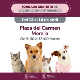 Morelia, Michoacán a 12 de Abril de 2023.- Del 12 al 14 de abril, la Secretaría de Salud de Michoacán (SSM) aplicará vacunas antirrábicas a perros y gatos en la plaza del Carmen del Centro Histórico de Morelia. La dependencia estatal informó que el módulo permanecerá instalado de...
