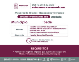 Morelia, Michoacán a 10 de Abril de 2023.- La Secretaría de Salud de Michoacán (SSM) recuerda a la población que la vacunación contra el COVID-19 aún no termina, y que los centros de salud del estado continuarán inmunizando a todos los mayores de 18 años que no cuenten...