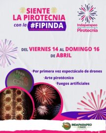 Morelia, Michoacán a 10 de Abril de 2023.- Del 14 al 16 de abril, en la Unidad Deportiva de Indaparapeo se realizará la Feria Internacional de la Pirotecnia, con la presencia de exponentes de diversas partes de México, así como de Perú, Rusia, Argentina y Líbano. En conferencia...