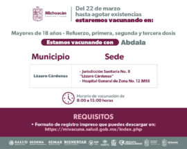 Morelia, Michoacán, 18 de marzo de 2023.- Las jornadas de vacunación contra el COVID-19 se mantienen activas en Michoacán, a dos años de su inicio, con el propósito de alcanzar coberturas del 100 por ciento entre la población. Del 20 al 31 de marzo se vacunará en 84...