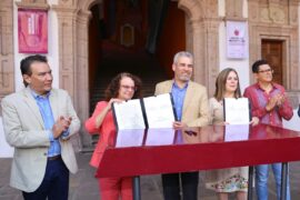 Morelia, Michoacán a 28 de Febrero de 2023.- El gobernador Alfredo Ramírez Bedolla, encabezó la firma de convenio que formaliza la creación de “Hecho de Michoacán, proveeduría de artesanías y productos michoacanos”, un programa donde los artífices buscan aportar valor agregado a los modelos de negocios de hoteles...