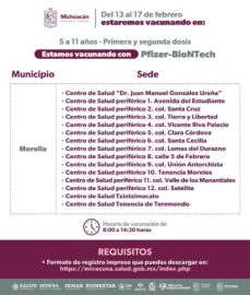 Morelia, Michoacán, 17 de febrero del 2023.- La Secretaría de Salud de Michoacán (SSM) recuerda a la población que los 15 centros de salud que hay Morelia continúan con la vacunación contra el COVID-19 de 8:00 a 14:30 horas. Es así que todos los menores de cinco a...
