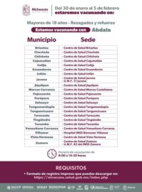 Morelia, Michoacán, a 29 de Enero del 2023.- Del 30 al 5 de febrero se continuará inmunizando a población mayor de 18 años con la vacuna Abdala para rezagados y refuerzo en 64 municipios. Es así, que se invita a los habitantes de Tanhuato, Angamacutiro, Morelos, Numarán, Zináparo,...