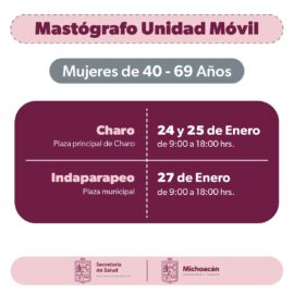 Morelia, Michoacán a 23 de Enero del 2023.- Del 24 al 27 de enero, la Secretaría de Salud de Michoacán (SSM) realizará mastografías gratuitas a mujeres de entre 40 a 69 años de edad en los municipios de Charo e Indaparapeo. En Charo, los estudios se efectuarán del...
