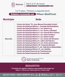 Morelia, Michoacán, 18 de enero del 2023.- Del 18 al 31 de enero continuará en Michoacán la vacunación contra el COVID-19 para niñas y niños de 5 a 11 años de edad que se encuentren en rezago y aún falten de inmunizar. Más de 60 municipios vacunarán en...