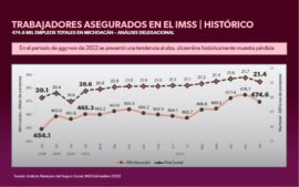 Morelia, Michoacán a 06 de Enero del 2022. Con base en los registros de la plataforma de consulta dinámica CUBOS del Instituto Mexicano del Seguro Social (IMSS), por primera vez en la historia Michoacán cerró año con una cifra por encima de los 470 mil trabajadores asegurados, expresó...