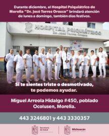 Morelia, Michoacán, 22 de diciembre del 2022.- Más de 17 mil consultas externas brindó en el año el Hospital Psiquiátrico de Morelia, ello en sus diferentes servicios gratuitos. La especialidad de Psiquiatría otorgó 9 mil 599 consultas, Psicología 4 mil 934, Dental mil 591 y Paidopsiquiatría mil 500...