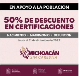 Morelia, Michoacán, 16 de diciembre de 2022.- En apoyo a la economía familiar, la Secretaría de Gobierno, mantiene el descuento del 50 por ciento en trámites de certificaciones de nacimiento, matrimonio y defunción. Como parte de las acciones emprendidas por el Gobierno del Estado para el combate a...