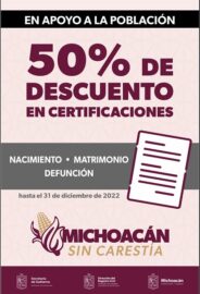 Morelia, Michoacán a 02 de Diciembre de 2022.- La Dirección del Registro Civil recuerda que en apego a las acciones de lucha contra la carestía, continúa con el beneficio del 50 por ciento de descuento en el costo total en certificaciones de nacimiento, matrimonio y defunción.“En el Gobierno del...