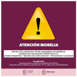 Morelia, Michoacán a 28 de Noviembre del 2022.- Para terminar con el rezago en vacunación, la Secretaría de Salud de Michoacán (SSM) abrirá durante dos únicos días un macro módulo para inmunizar a todos los mayores de 18 años y a los adolescentes de 12 a 17 con...