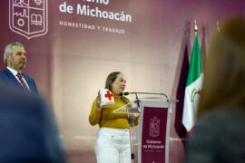 Morelia, Michoacán, 28 de noviembre del 2022.- El gobernador Alfredo Ramírez Bedolla, acompañado de la presidenta honoraria del Sistema DIF estatal, Grisel Tello Pimentel, y de Ignacio Gallardo Reyes, delegado de la Cruz Roja Michoacán, exhortó a las y los michoacanos a sumarse a la colecta de la...