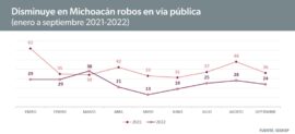 Morelia, Michoacán, 16 de noviembre del 2022.- El robo a transeúntes en la vía pública presenta una reducción del 52 por ciento este año en Michoacán, al pasar de 470 casos registrados de enero a diciembre del 2021, a 226 víctimas de enero a septiembre del año en...