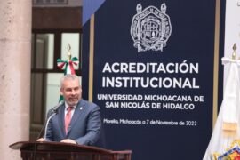 Morelia, Michoacán a 07 de Noviembre del 2022.- Durante la entrega de la acreditación institucional a la Universidad Michoacana de San Nicolás de Hidalgo (UMSNH), el gobernador Alfredo Ramírez Bedolla destacó la importancia de este logro, al cumplir con creces las funciones para hacerse acreedora a esta certificación,...