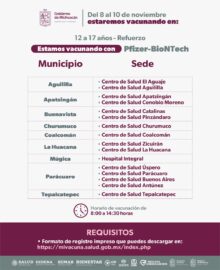 Morelia, Michoacán a 08 de Noviembre del 2022.- La Secretaría de Salud de Michoacán (SSM) anuncia la aplicación del refuerzo contra el COVID-19, a los adolescentes de 12 a 17 años de edad del interior del estado. Se trata de un refuerzo de los laboratorios Pfizer BioNTech para...
