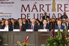 Uruapan, Michoacán, 21 de octubre del 2022.- El gobernador Alfredo Ramírez Bedolla, asistió al acto conmemorativo del 157 aniversario luctuoso de los Mártires de Uruapan donde el presidente del Comité Ejecutivo Nacional de Morena, Mario Delgado Carrillo, manifestó su respaldo para que más de 100 mil trabajadores del...