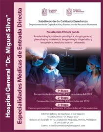 Morelia, Michoacán, 19 de octubre del 2022.- El Hospital General de Morelia “Dr. Miguel Silva” abrió la convocatoria para aspirantes nacionales y extranjeros a residencias médicas y los posgrados de alta especialidad en resonancia magnética de corazón y angiotomografía. La selección se realizará en tres etapas, la primera...