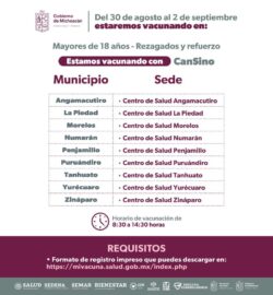 Morelia, Michoacán, 31 de agosto del 2022.- El Gobierno del Estado, a través de la Secretaría de Salud de Michoacán (SSM), vacunará durante todo el mes de septiembre a los rezagados, mayores de 18 años, que aún no cuenten con ninguna dosis aplicada contra el Covid-19 o que...