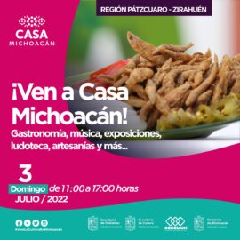 Morelia, Michoacán a 3 de Julio de 2022.- La Secretaría de Cultura de Michoacán (SECUM) invita a la población en general a pasar un domingo familiar en Casa Michoacán y disfrutar de actividades artísticas y culturales, música, danza y gastronomía de la Región Pátzcuaro – Zirahuén, la cual...