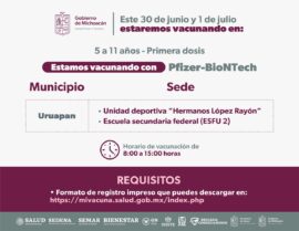 Morelia, Michoacán a 28 de Junio del 2022.- La vacunación anti Covid-19 para niños de 5 a 11 años de edad, en Morelia, avanzó con una aplicación de 16 mil 260 biológicos, a igual número de infantes. La jornada para este grupo etario se realizará en Morelia, del...