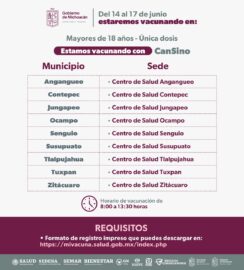 Morelia, Michoacán, a 14 de junio del 2022.- En aras de reducir el rezago de vacunación en la población del estado, la Secretaría de Salud de Michoacán (SSM) aplicará, del 14 al 17 de junio, dosis anti COVID-19 a personas mayores de 18 años, en nueve municipios. La...