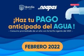 Morelia, Michoacán, a 31 de enero de 2022.- El Organismo Operador de Agua Potable, Alcantarillado y Saneamiento de Morelia (OOAPAS) mantendrá su Programa de Pago Anticipado todo el mes de febrero, para que los morelianos paguen el agua del 2022 con la tarifa del 2021. Durante todo febrero,...