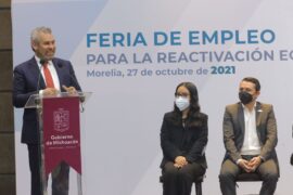Morelia, Michoacán, 27 de octubre del 2021.- El gobernador Alfredo Ramírez Bedolla inauguró la Feria del Empleo para la Reactivación Económica en la que, 50 empresas ofrecen 600 vacantes a las y los michoacanos que buscan trabajo. En el evento, el mandatario estatal anunció que para noviembre se...