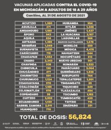 Morelia, Michoacán, a 31 de agosto de 2021.- Avanzan las jornadas de inmunización anti COVID-19, con la aplicación de 286 mil 809 dosis para jóvenes de 18 a 29 años. Hasta el momento se han inmunizado jóvenes de 59 municipios con el biológico de diferentes farmacéuticas: CanSino, Sinovac,...